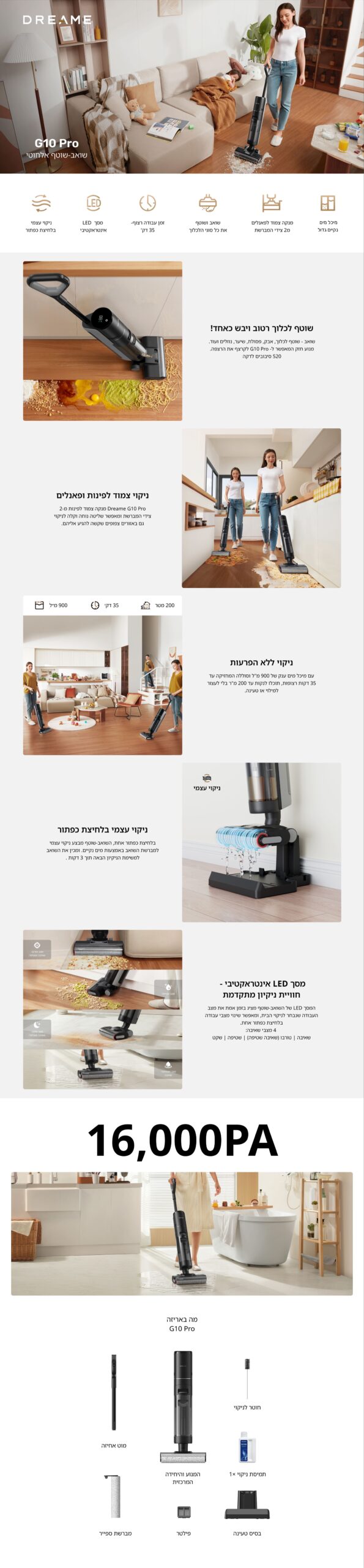 Dreame G10 Pro שוטף ושואב בו־זמנית. הוא מתאים לכל סוגי לכלוך יומיומי. המערכת שואבת ומקרצפת בפס אחד. ניקוי קצוות משני הצדדים משאיר פינות נקיות. לחיצה אחת מפעילה ניקוי עצמי לצינור ולמברשת. הסוללה מספקת עבודה עד 35 דקות. הספק 300W ותאוצת יניקה של 16 kPa מסירים אבק יבש ונוזלים. מיכל מים נקיים 900 מ״ל ומיכל מי פסולת 700 מ״ל. ארבעה מצבים מאפשרים התאמה לבית ולשגרה. הוא מקל על ניקוי רצפות יומי. הפעל, נקה, ורענן את הבית במהירות.